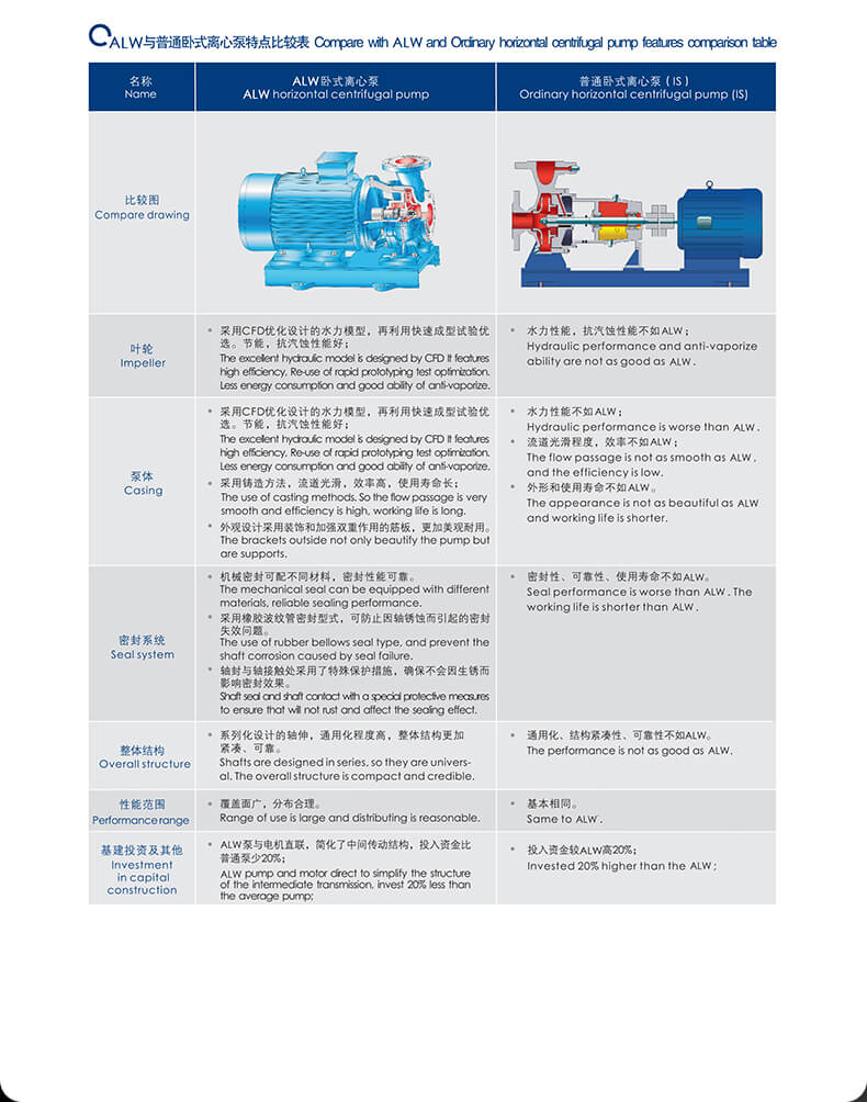 ALW型臥式離心泵根 據(jù)IS型離心泵與立式泵的獨(dú)特結(jié)構(gòu)組合設(shè)計(jì),并嚴(yán)格按照國(guó)際標(biāo)準(zhǔn)ISO2858和最新的國(guó)家管道離心泵標(biāo)準(zhǔn)JB/T53058-93進(jìn)行設(shè)計(jì)制造的高效節(jié) 能產(chǎn)品。采用國(guó)內(nèi)先進(jìn)水力模型優(yōu)化設(shè)計(jì)而成。同時(shí)根據(jù)使用溫度、介質(zhì)等不同在ALW型基礎(chǔ)上派生出熱水泵、高溫泵、化工泵、油泵等,是目前國(guó)家標(biāo)準(zhǔn)定型推廣產(chǎn)品。