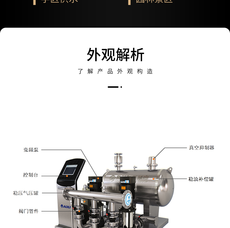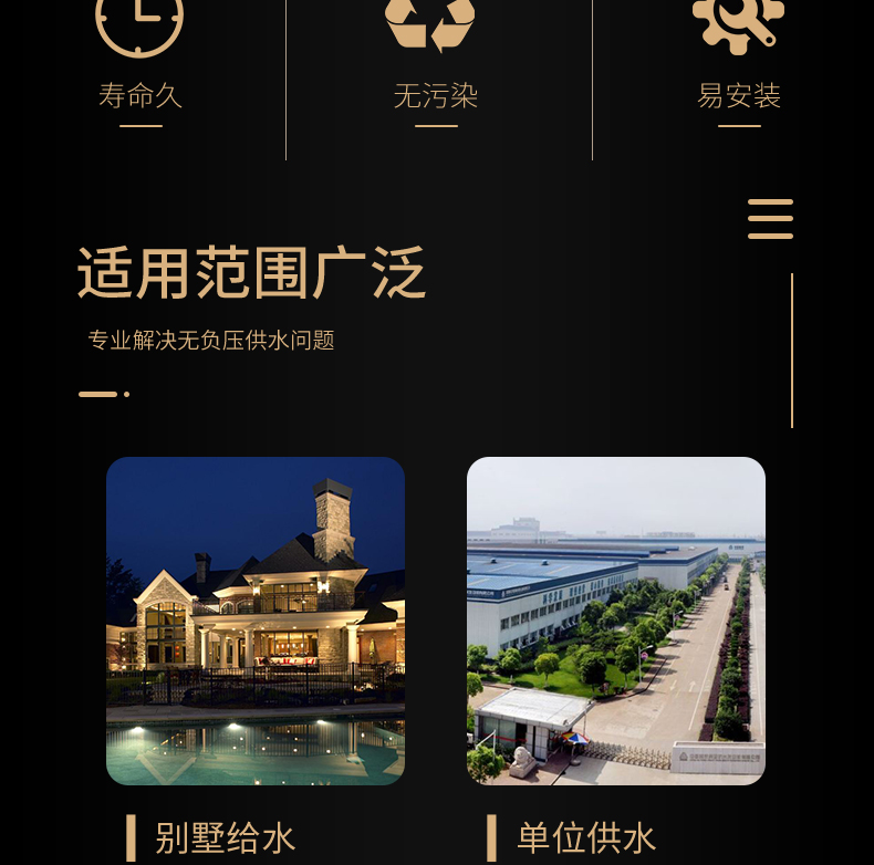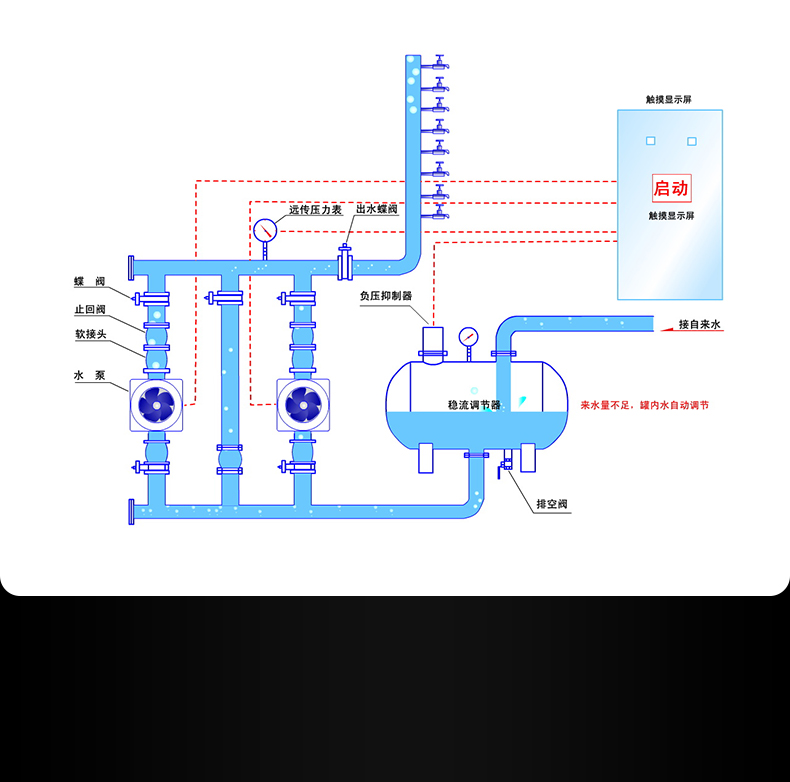ALCW智能型無負壓供水設備是以市政管網(wǎng)為水源,充分利用了市政管網(wǎng)原有的壓力,形成密閉的連續(xù)接力增壓供水方式,節(jié)能效果好,沒有水質(zhì)的二次污染,是變頻恒壓供水設備的發(fā)展與延伸。適用于任何壓力不足的區(qū)域;住宅小區(qū)、寫字樓、商場、學校、部隊、工廠、浴池、景區(qū)、政府辦公樓、老舊泵房改造等;工礦企業(yè)的生產(chǎn)生活用水,各種循環(huán)用水系統(tǒng)。