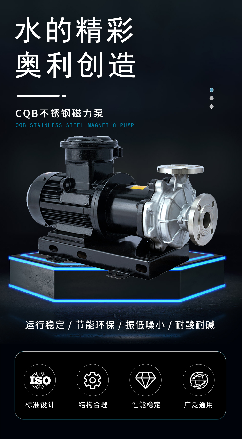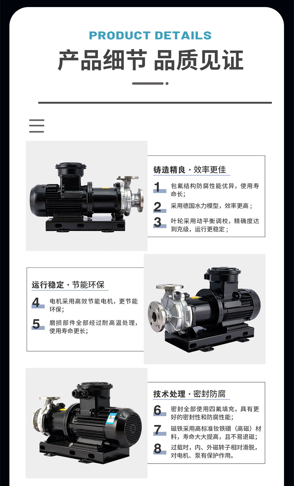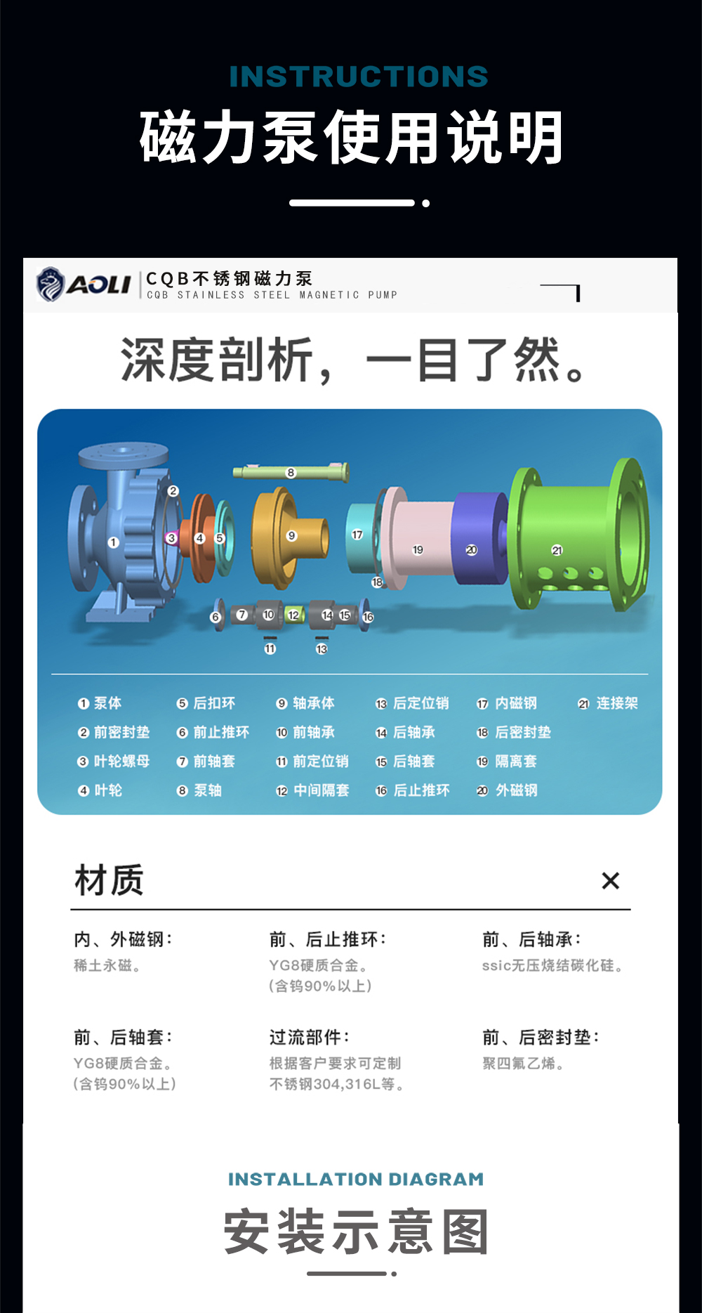CQB不銹鋼磁力泵運(yùn)用CFX、CFD相結(jié)合分析計(jì)算得到高性能的水力模型,過(guò)流部件采用304、316L等優(yōu)質(zhì)不銹鋼材質(zhì),內(nèi)、外磁轉(zhuǎn)子選用高磁能積、高矯頑力的稀土永磁制造,具有高效節(jié)能、介質(zhì)適用面廣、耐高溫、磁性強(qiáng)、不退磁等優(yōu)點(diǎn),是應(yīng)用磁力耦合實(shí)現(xiàn)無(wú)接觸傳動(dòng)、無(wú)動(dòng)密封的新型高品質(zhì)磁力傳動(dòng)離心泵。全密封、無(wú)泄漏、清潔環(huán)保、運(yùn)行靜音低振,是輸送易燃、易爆、腐蝕、貴重液體的首選用泵。因節(jié)能環(huán)保、可靠安全,并替代進(jìn)口為用戶節(jié)約大量成本。廣泛應(yīng)用于化工、制堿、石油、醫(yī)藥、衛(wèi)生、農(nóng)藥、造紙、染料、污水處理等領(lǐng)域。