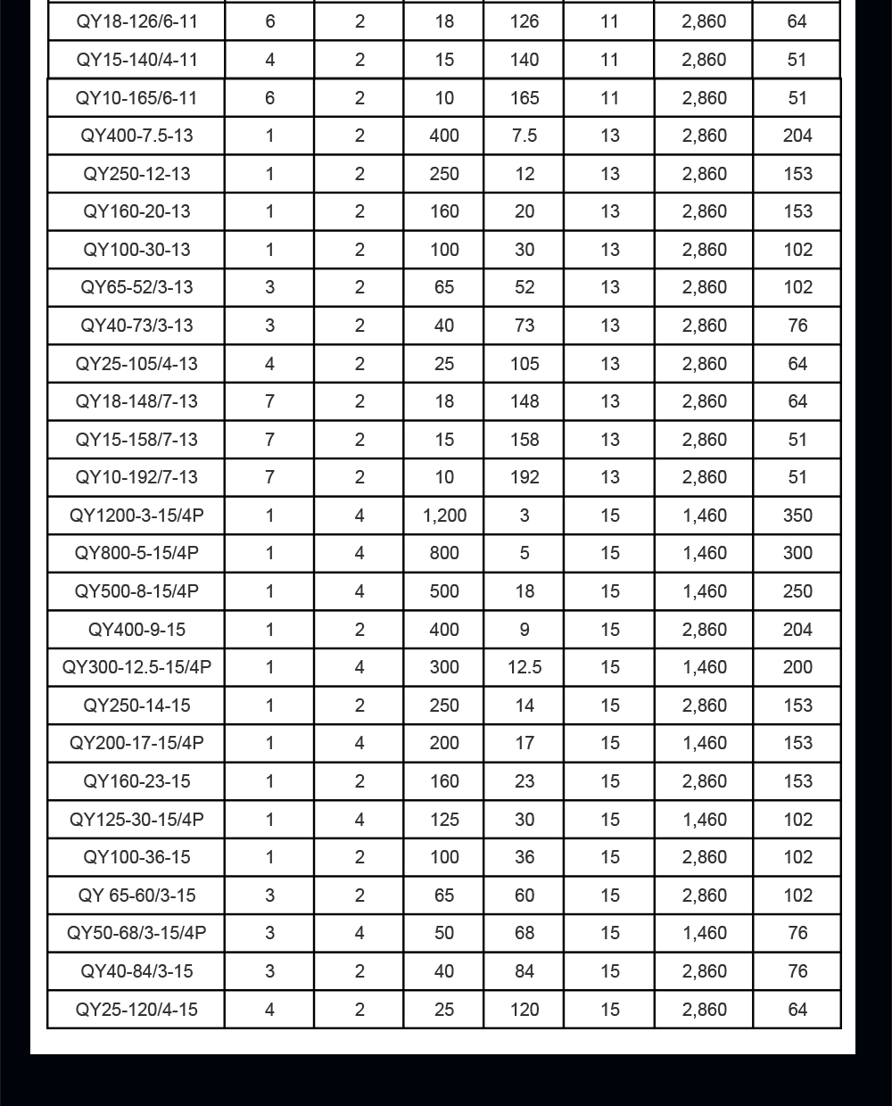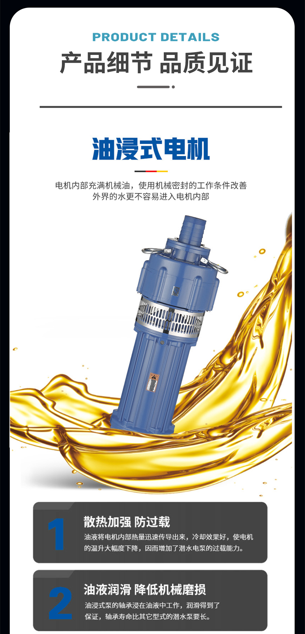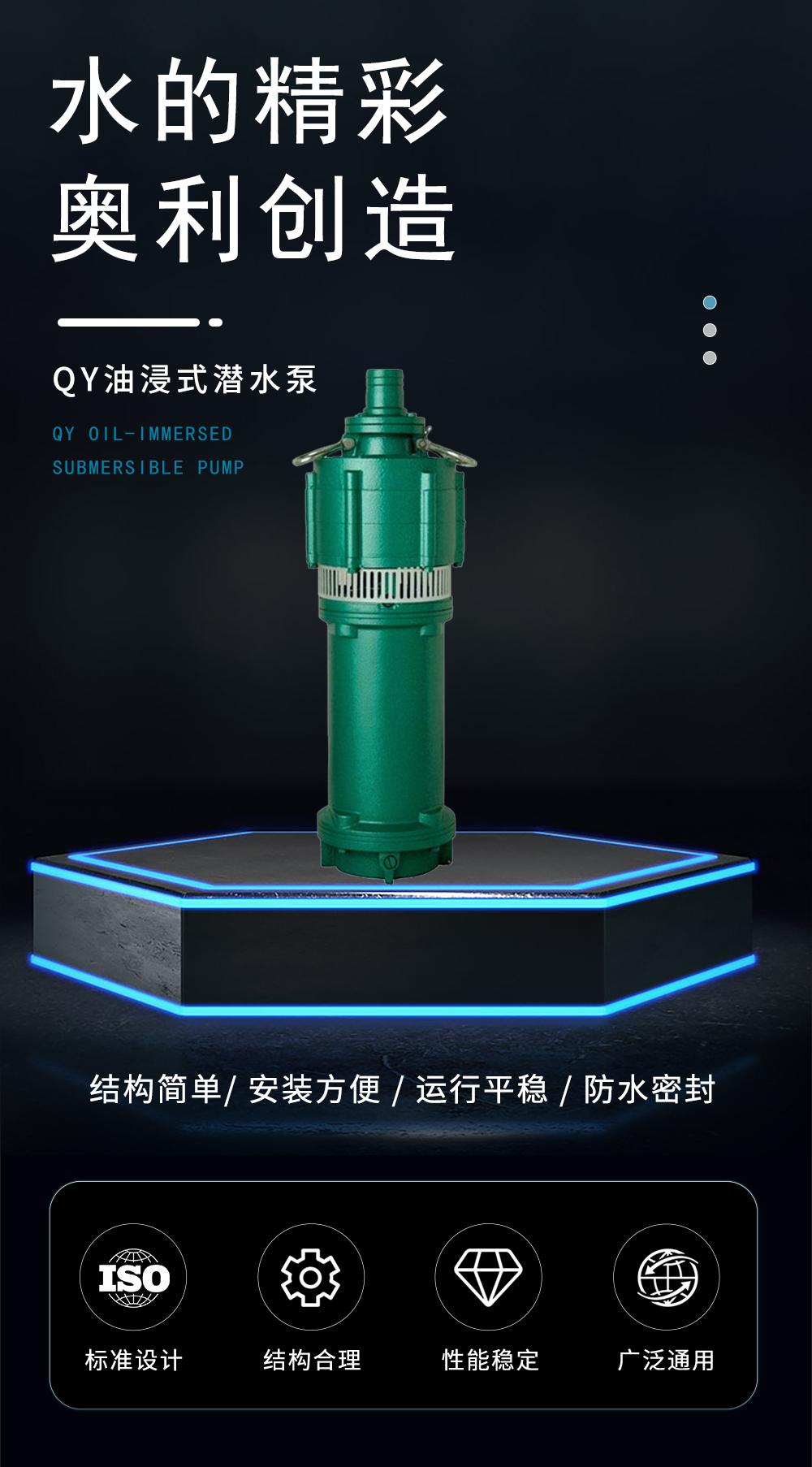 QY系列全揚程油浸式潛水電泵由潛水電機、水泵、密封三部分組成。水泵位于產品上部,電機位于產品下端,該系列產品由于流量及揚程適用范圍極廣,是廣大農村、工礦企業(yè)廣泛使用的電力排灌設備,適用于農業(yè)排灌、礦山排水、園林噴灌、井下提水、水塔進水、城建用水等場合排水。