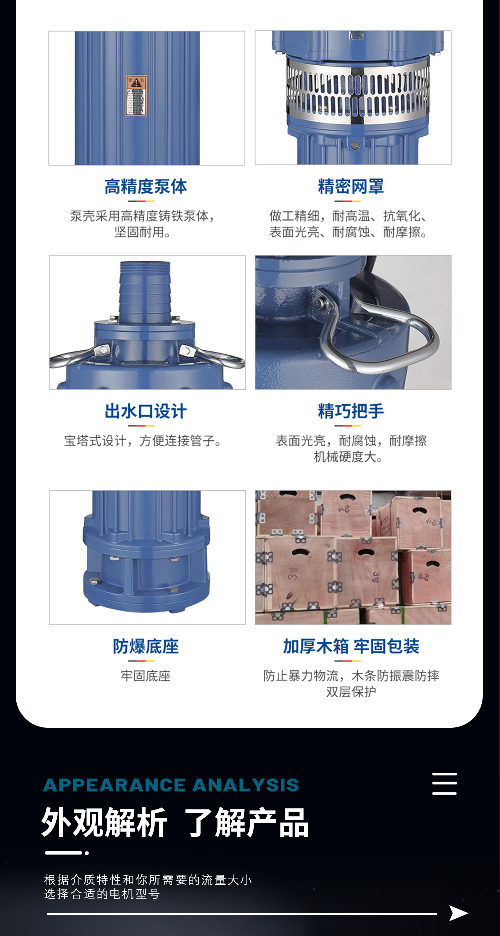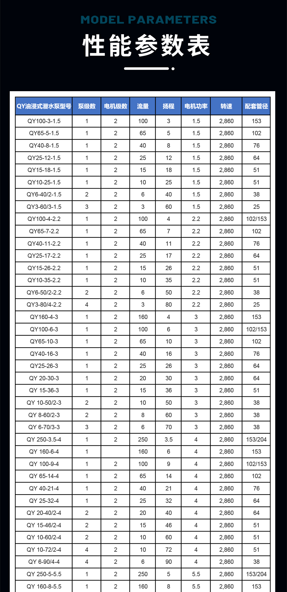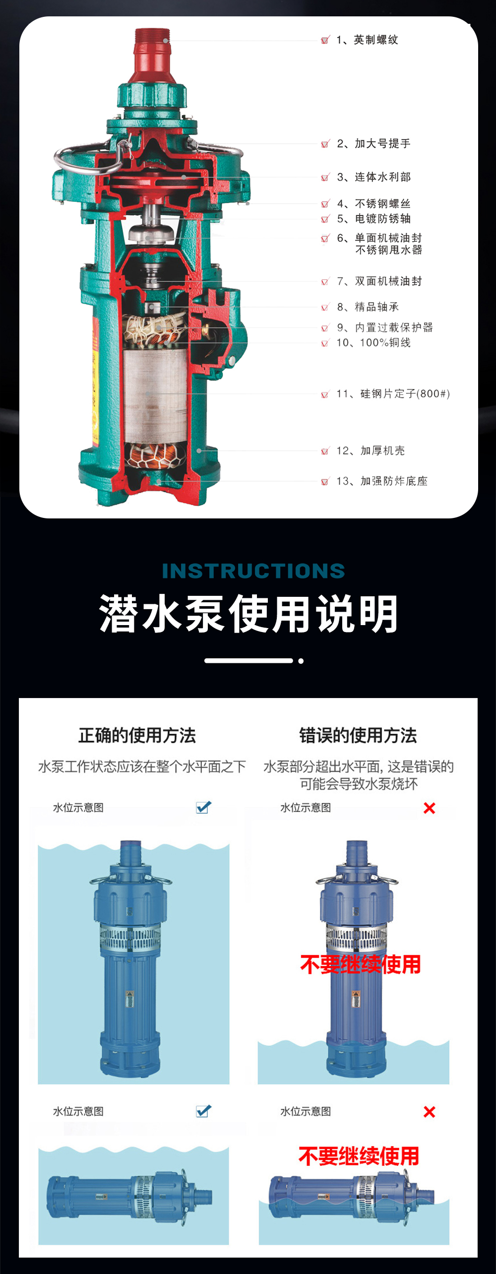 QY系列全揚程油浸式潛水電泵由潛水電機、水泵、密封三部分組成。水泵位于產品上部,電機位于產品下端,該系列產品由于流量及揚程適用范圍極廣,是廣大農村、工礦企業(yè)廣泛使用的電力排灌設備,適用于農業(yè)排灌、礦山排水、園林噴灌、井下提水、水塔進水、城建用水等場合排水。