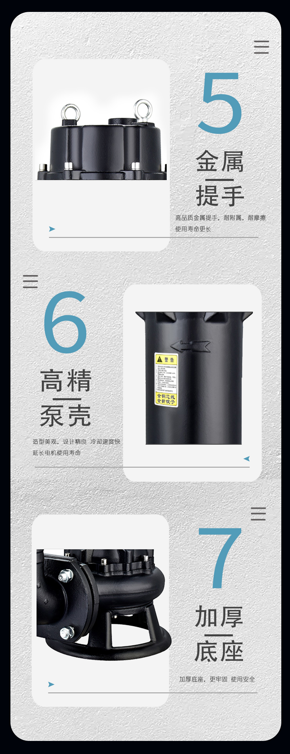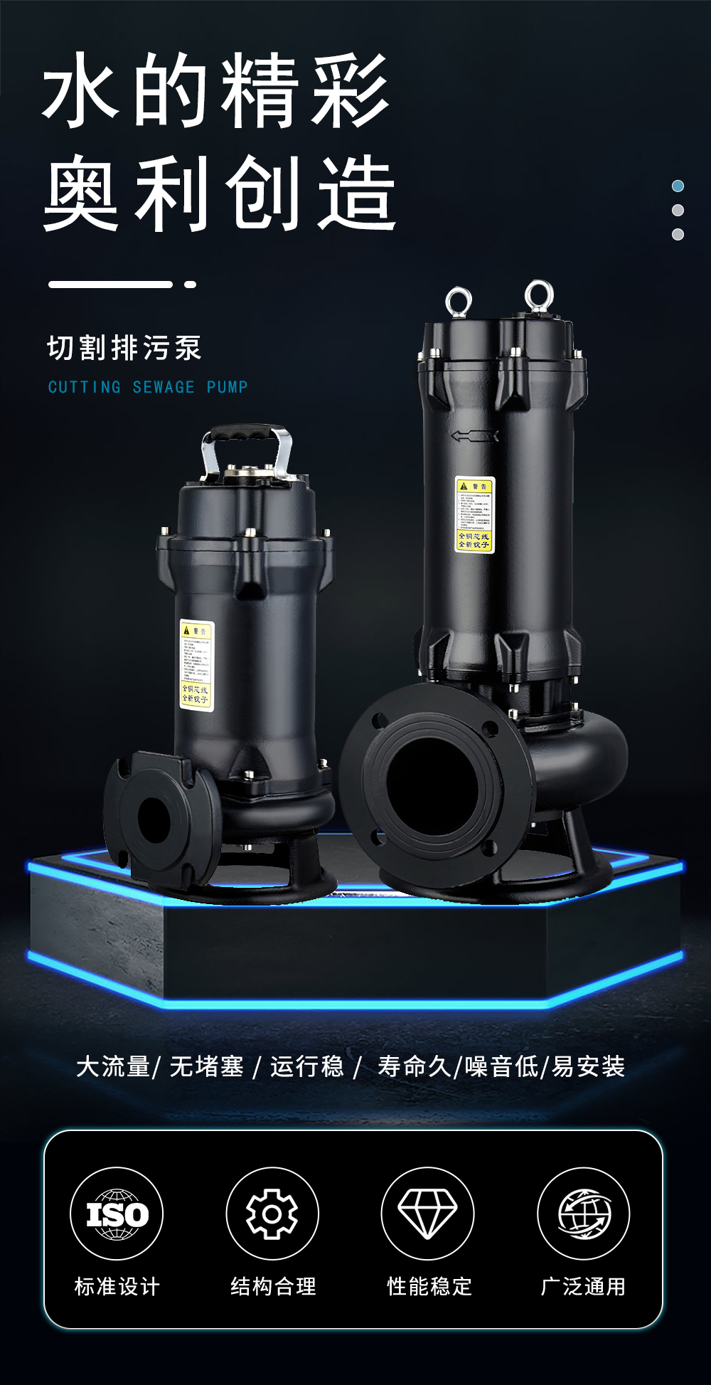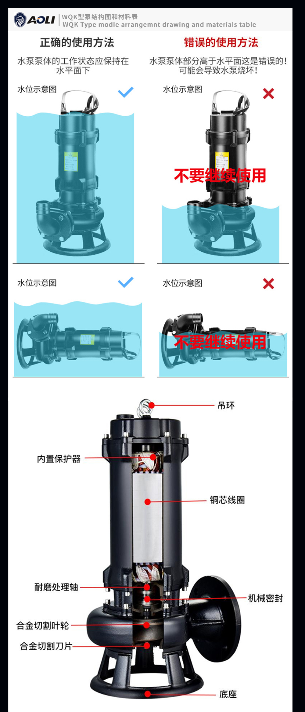 WQK/QG帶切割裝置排污泵具有排污通過能力特別強(qiáng),帶切割性能好,能將污水中的長纖維、塑料、紙、帶、布條、稻草、繩子等雜質(zhì)切碎后排出,采用最先進(jìn)的方法,設(shè)計成最合理的水力特性,使電泵可以全揚(yáng)程運(yùn)行,優(yōu)良的干式電機(jī)和水泵的最佳組合,無堵塞排污泵使電泵的總效率達(dá)到西德abs公司的ass帶切割裝置系列產(chǎn)品相同,電泵采用高質(zhì)量的硬質(zhì)合金,雙端面機(jī)械密封和骨架油封組面部位,不得超過電動機(jī)高度的1/2,抽送污物溫度不超過60℃。