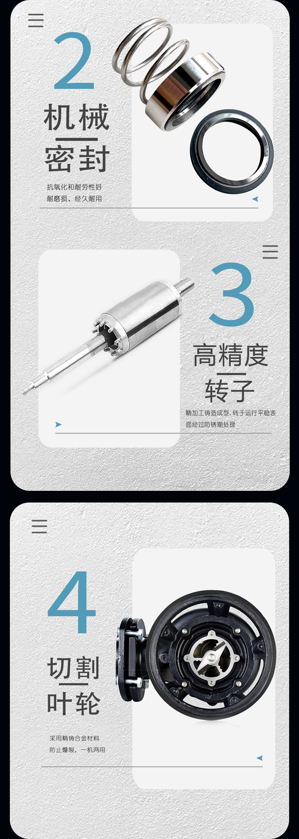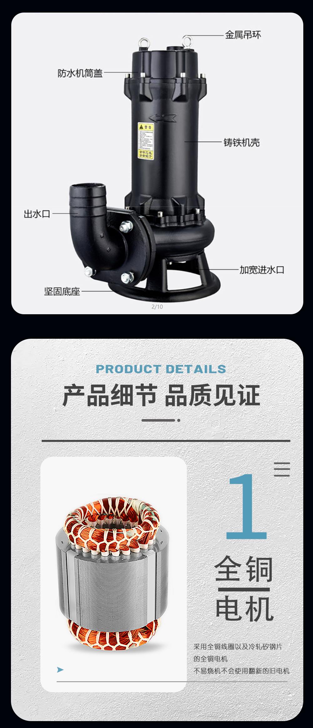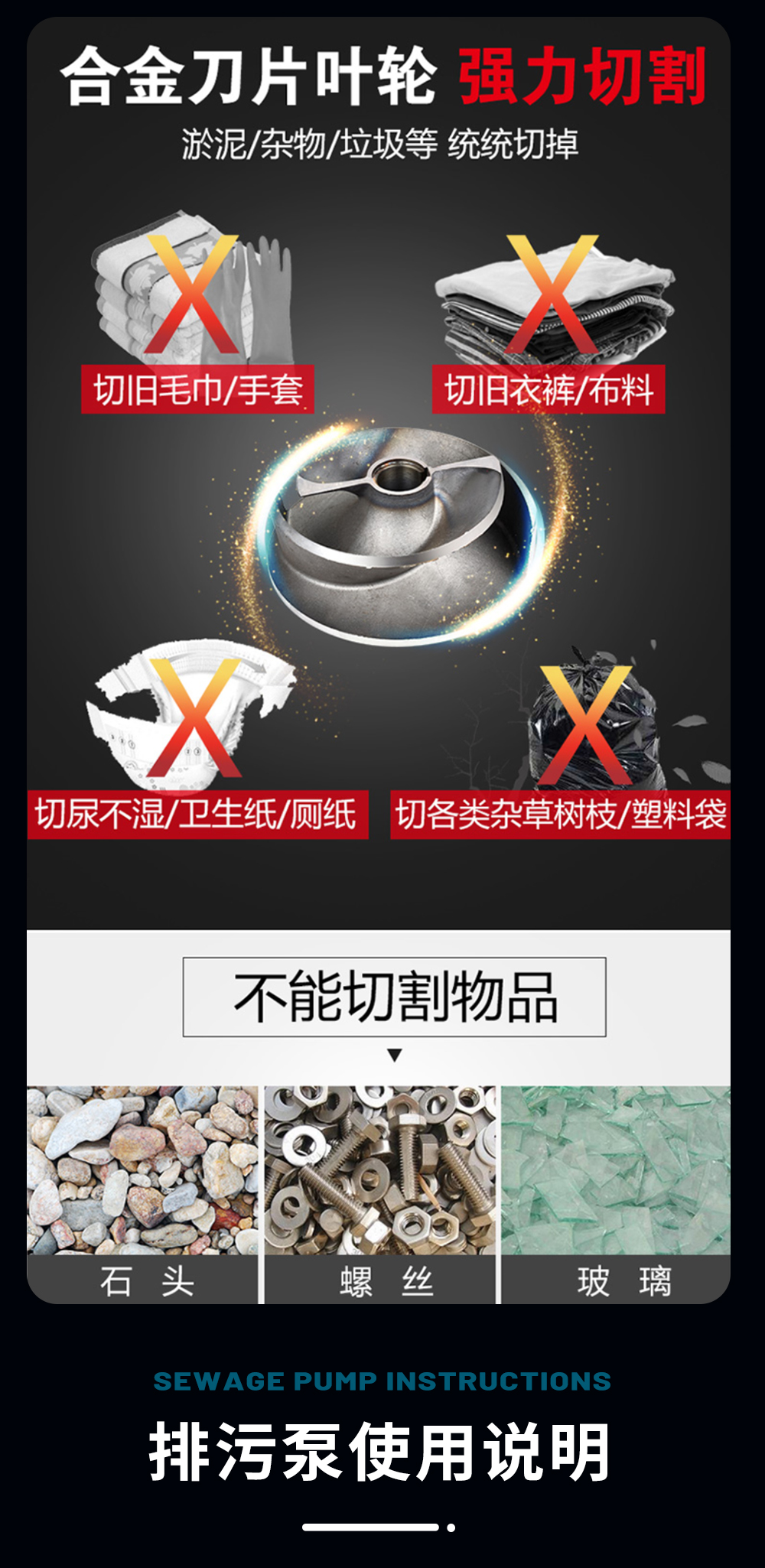 WQK/QG帶切割裝置排污泵具有排污通過能力特別強(qiáng),帶切割性能好,能將污水中的長纖維、塑料、紙、帶、布條、稻草、繩子等雜質(zhì)切碎后排出,采用最先進(jìn)的方法,設(shè)計成最合理的水力特性,使電泵可以全揚(yáng)程運(yùn)行,優(yōu)良的干式電機(jī)和水泵的最佳組合,無堵塞排污泵使電泵的總效率達(dá)到西德abs公司的ass帶切割裝置系列產(chǎn)品相同,電泵采用高質(zhì)量的硬質(zhì)合金,雙端面機(jī)械密封和骨架油封組面部位,不得超過電動機(jī)高度的1/2,抽送污物溫度不超過60℃。
