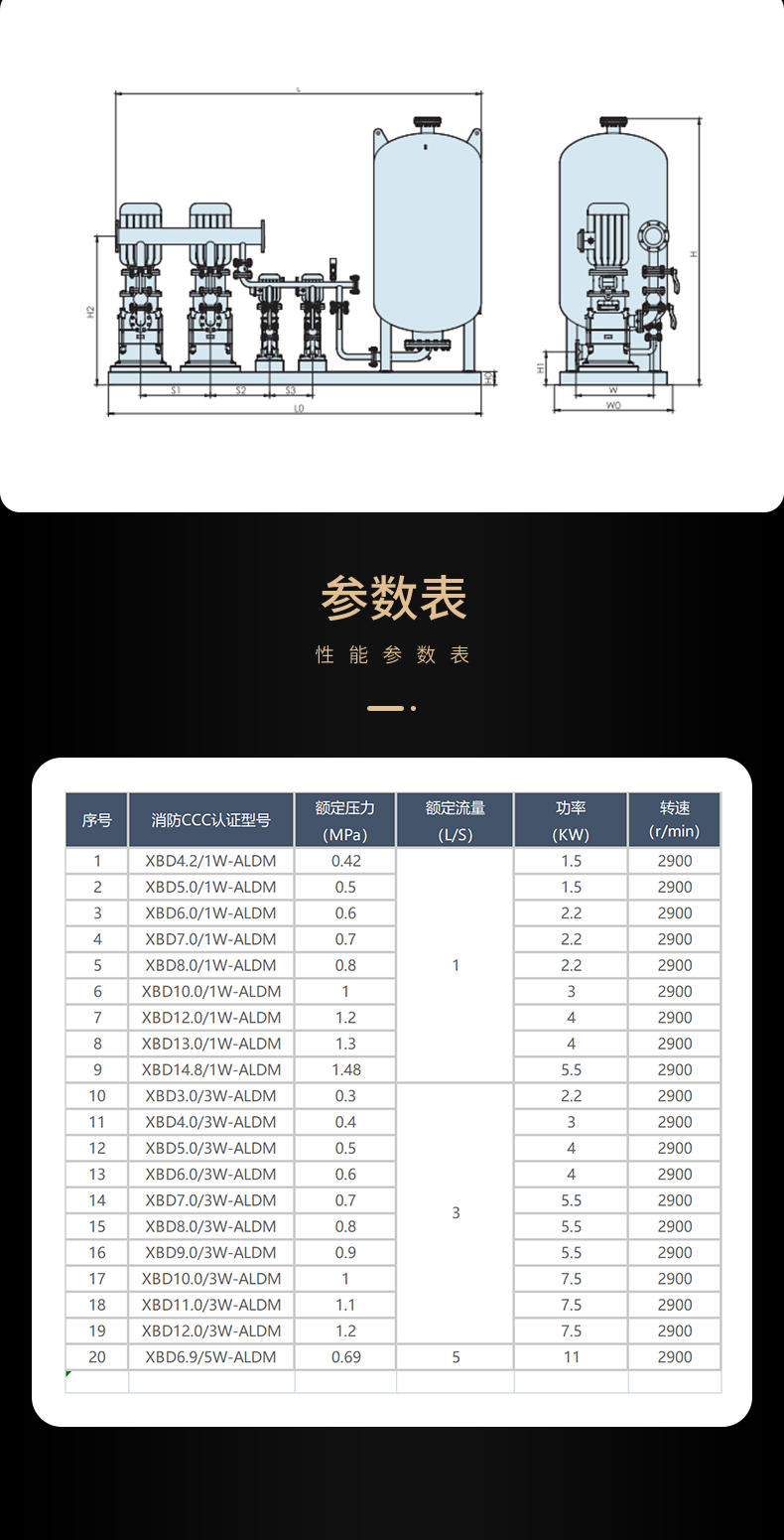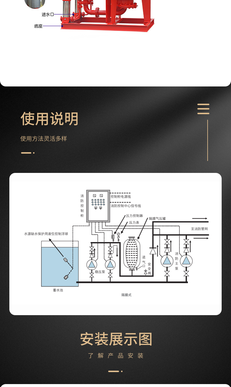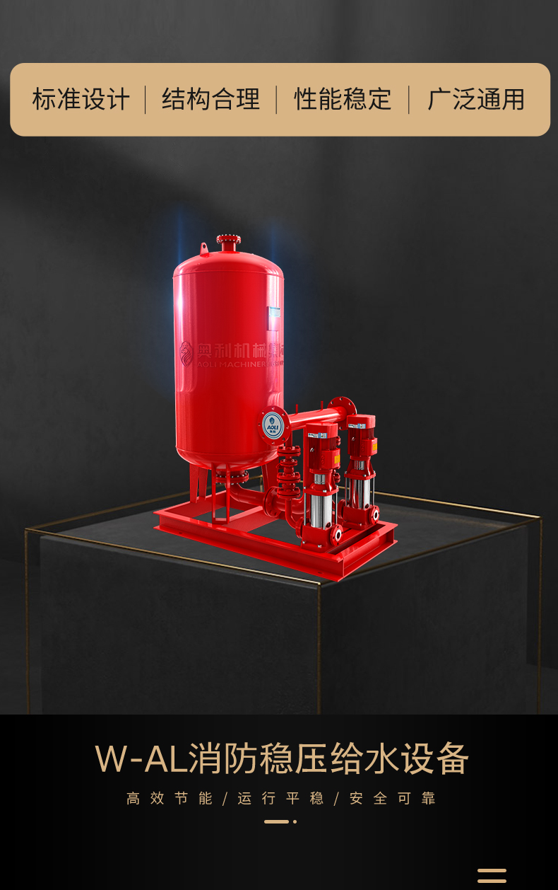 W-AL消防穩(wěn)壓給水設(shè)備是利用食品級(jí)橡膠作為氣水隔離的新型設(shè)備,一次充氣,常年運(yùn)行使用。通過(guò)電接點(diǎn)壓力表和電控箱控制水泵運(yùn)行,達(dá)到額定的壓力和連續(xù)供水。是按照國(guó)家消防設(shè)計(jì)規(guī)范GB50016《建筑設(shè)計(jì)防火規(guī)范》及國(guó)家標(biāo)準(zhǔn) GB27898.3《固定消防給水設(shè)備第四部分∶ 消防增壓穩(wěn)壓給水設(shè)備》設(shè)計(jì)、制造的消防專用的增壓穩(wěn)壓設(shè)備。該設(shè)備由隔膜式氣壓罐、增壓泵、電控箱、儀表和管路附件等組成,適用于多層和高層建筑工程有增壓要求的消火栓給水系統(tǒng)及自動(dòng)噴水滅火系統(tǒng)等各類消防給水系統(tǒng)。