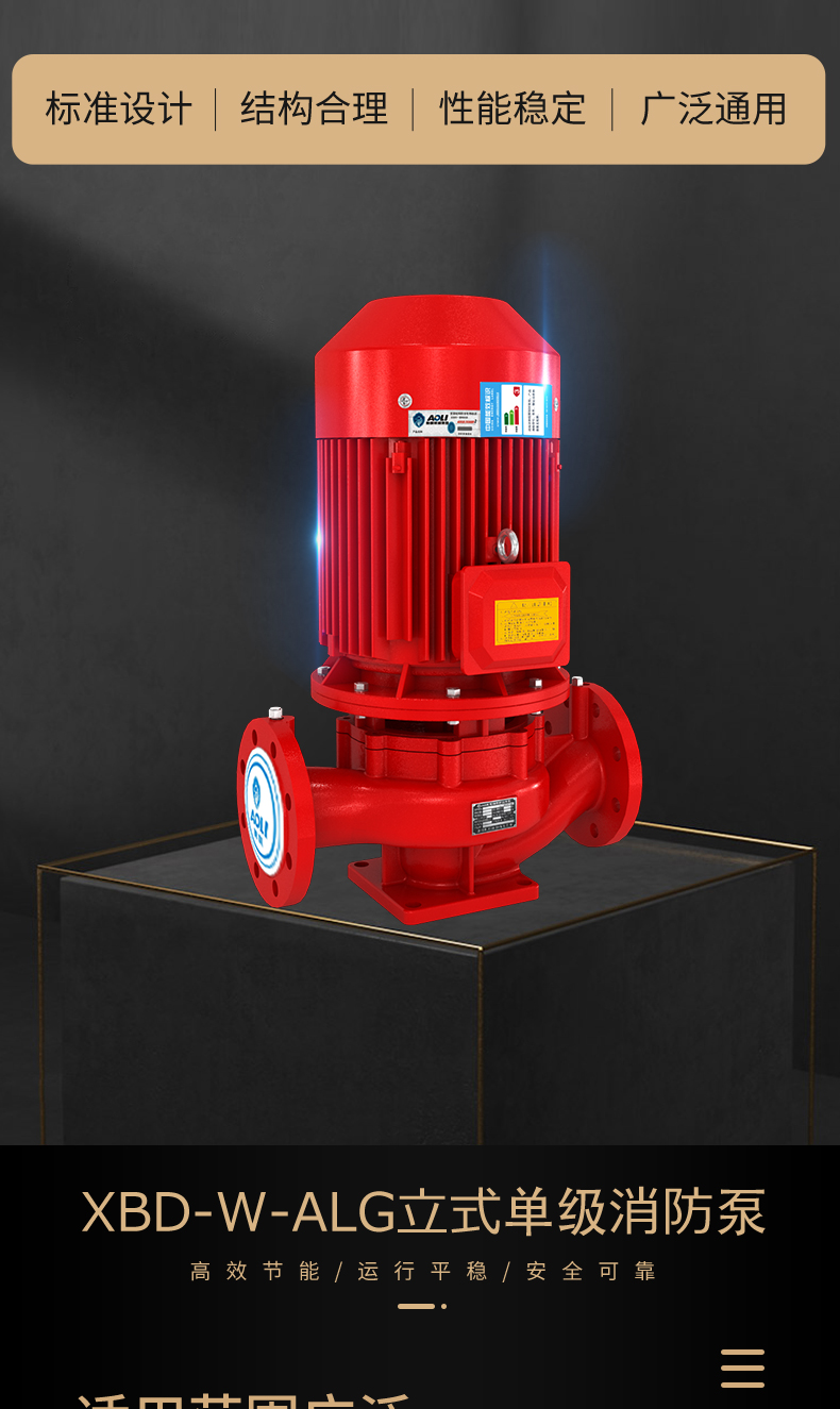XBD-ALG立式單級(jí)消防泵是一種消防用具,供輸送不含固體顆粒的清水及物理化學(xué)性質(zhì)類似于水的液體之用,主要用于消防系統(tǒng)管道增壓送水和各種場合的消防給水(消防栓滅火系統(tǒng)、自動(dòng)噴淋滅火系統(tǒng)和水噴霧滅火系統(tǒng)等),也可適用于工業(yè)和城市給排水,高層建筑增壓送水、遠(yuǎn)距離送水、采暖、浴室、鍋爐冷暖水循環(huán)、增壓空調(diào)制冷系統(tǒng)送水及設(shè)備配套等場合。