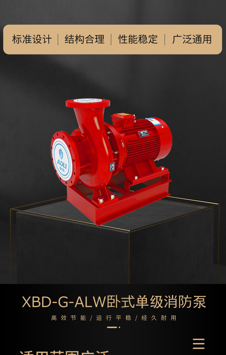 XBD-ALW臥式單級消防泵是一種消防用具,供輸送不含固體顆粒的清水及物理化學(xué)性質(zhì)類似于水的液體之用,主要用于消防系統(tǒng)管道增壓送水和各種場合的消防給水(消防栓滅火系統(tǒng)、自動噴淋滅火系統(tǒng)和水噴霧滅火系統(tǒng)等),也可適用于工業(yè)和城市給排水,高層建筑增壓送水、遠距離送水、采暖、浴室、鍋爐冷暖水循環(huán)、增壓空調(diào)制冷系統(tǒng)送水及設(shè)備配套等場合。