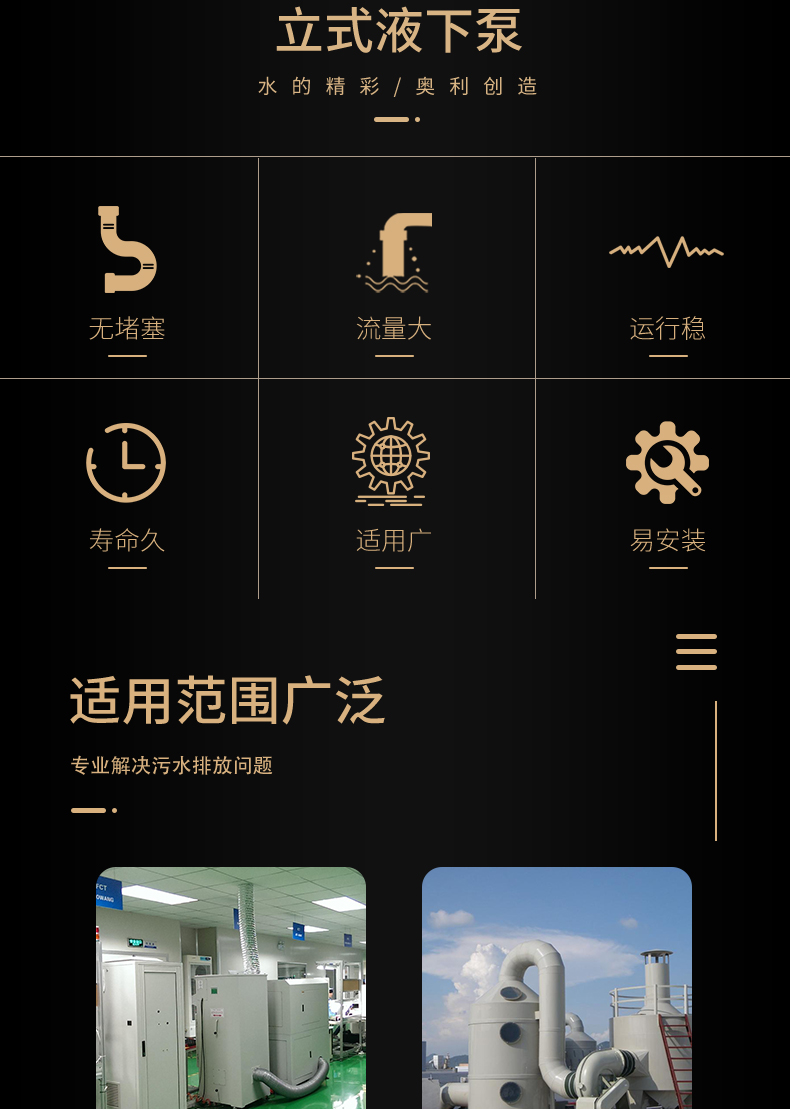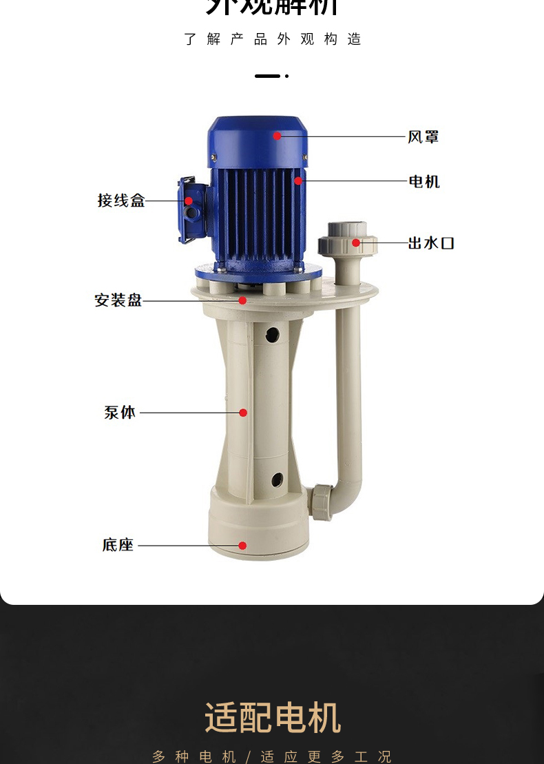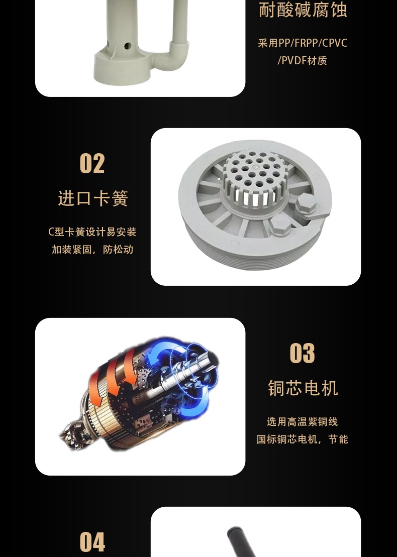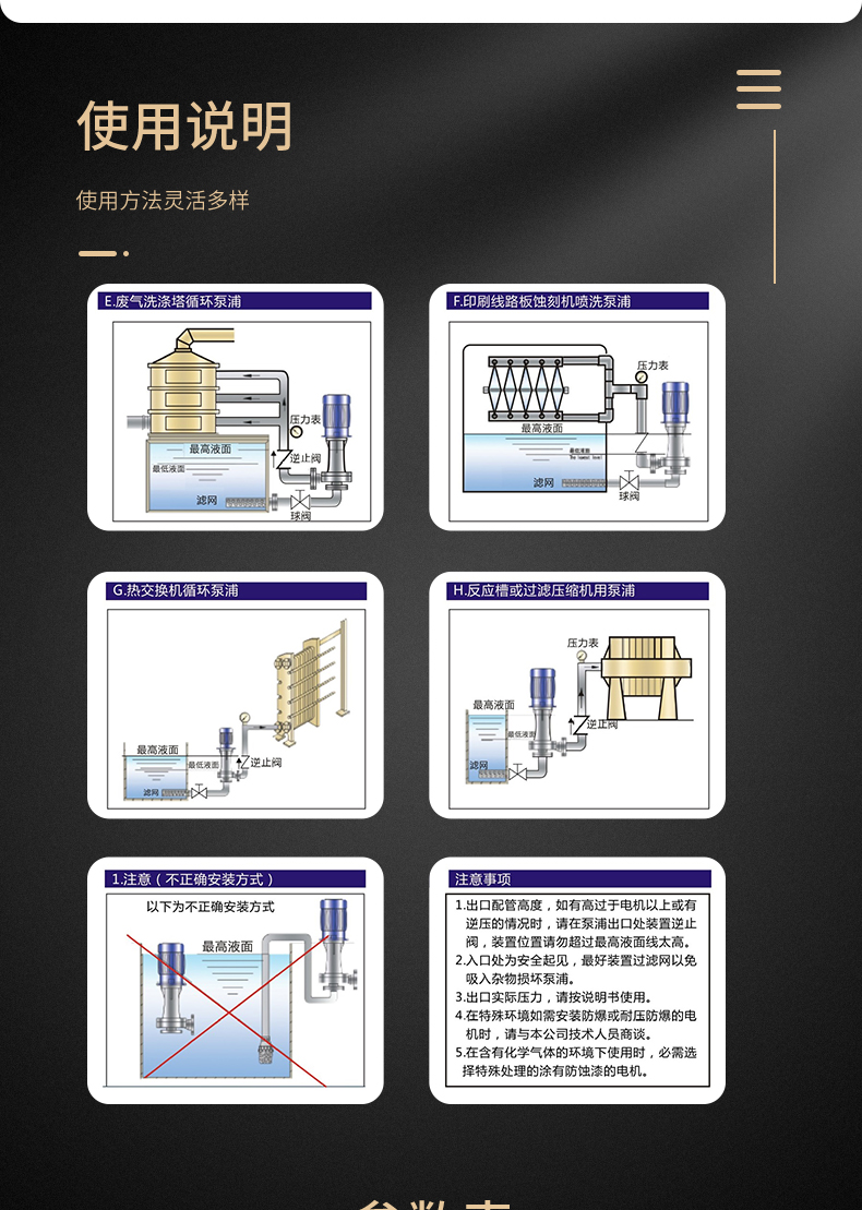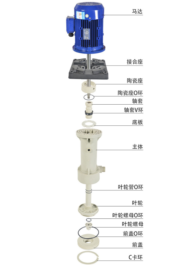 FSY塑料液下泵過流部件均采用超高分子量聚乙烯工程塑料制成,既具有優(yōu)異的耐腐性,又具有非常好的耐磨性和優(yōu)良的抗沖擊性。在輸送磷酸、混酸、氫氟酸、氟硅酸、電解液、石灰水、污水等含顆粒的腐蝕性液體方面顯示了優(yōu)良的性能。適用于輸送含有大量顆粒的腐蝕性料漿(料漿的重量濃度<20%,固體顆粒直徑<0.5mm。不銹鋼液下泵的適用溫度為90℃以下,在介質(zhì)和工況相同的條件下可替代價格昂貴的特種不銹鋼和氟塑料液下泵。