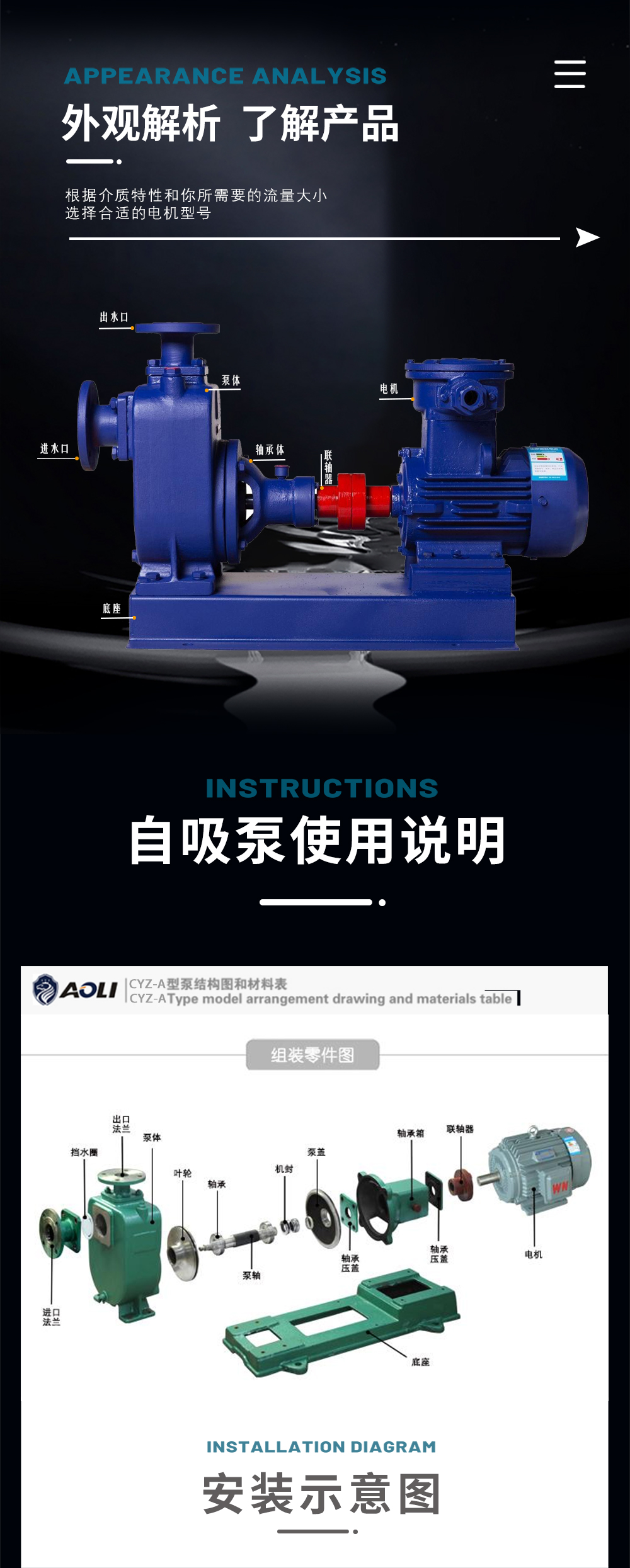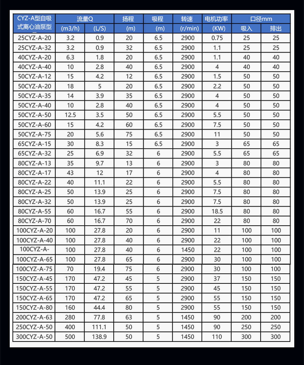 CYZ-A型自吸式自吸泵是 根據國內外有關技術資料經消化、吸收、改進后研制而成的最新泵類產品,該自吸泵適用于石油行業(yè)、陸地油庫、油罐車的理想產品,并適合于作船用貨油泵、艙底 泵、消防泵和壓載泵及機器冷卻水循環(huán)等,分別輸送汽油、煤油、柴油、航煤等石油產品和海水、清水,介質溫度-20℃-80℃,如輸送化工液體可改用耐腐蝕 機械密封。
